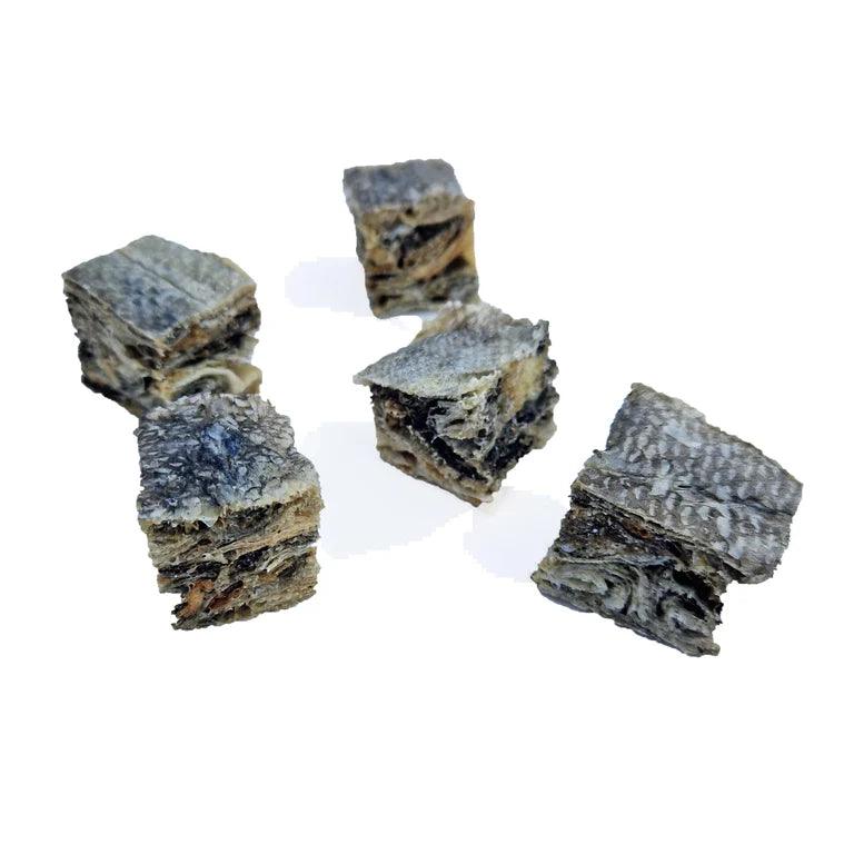 Healthy, natural, and delicious, these Fish Skin Cubes are an easily digestible treat, suitable for all ages. The rough texture helps to remove tartar and keep teeth healthy whilst the high proportion of high quality proteins, fats and oils are a great source of Omega 3! In turn, these contribute to boosting overall skin, joint and brain health - whilst being irresistible to your pooch!