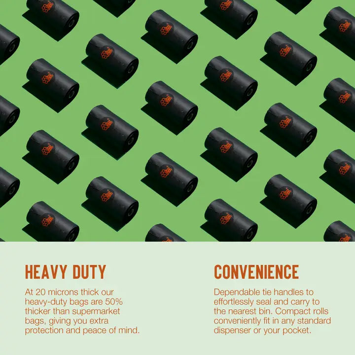 - Heavy Duty Dog Poo Bags: Our Heavy Duty Compostable Dog Poop Bags are 20 microns thick – over 50% thicker than average compostable dog poop bags